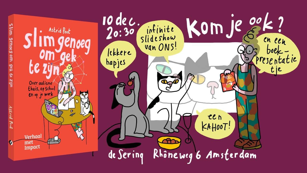 Een oneindige slideshow met foto's van de katten Pat en Mat, een Kahoot, drankjes en de presentatie van het nieuwe boek van Astrid Poot: een graphic novel over uitdagingen, voordelen en vooroordelen van leven met autisme. Met een hoofdrol voor de eigenwijze kat Dokter Mat en vol praktische tips voor autisten en omstanders. Openhartig, beeldend en vol zelfspot.