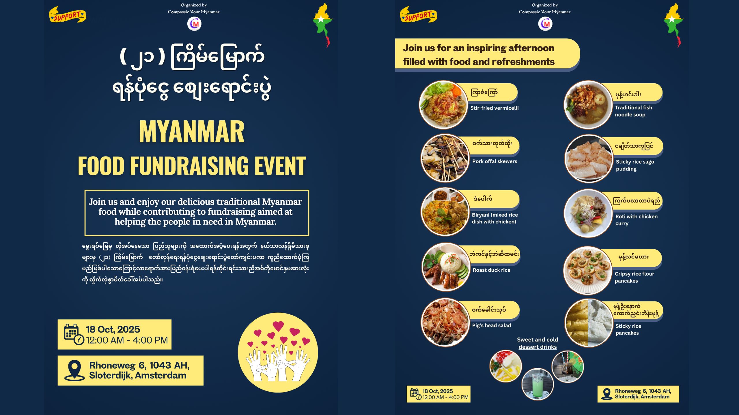 Join us and enjoy our delicious traditional Myanmar food while contributing to fundraising aimed at helping the people in need in Myanmar.